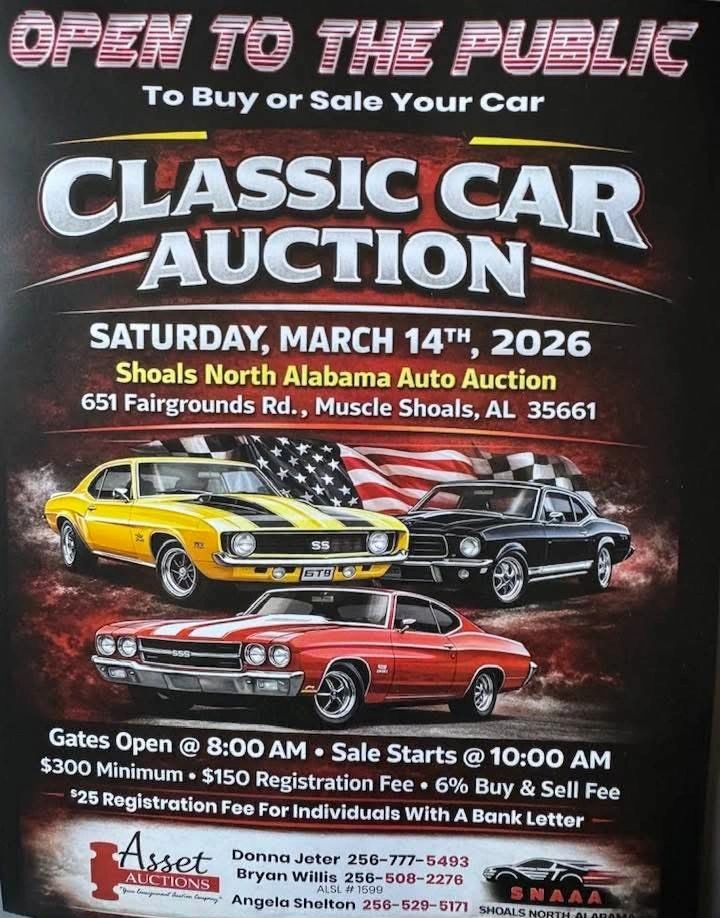 Asset Auctions 2026 Auction Day for Shoals North Alabama Auto Auction, 625 Fairground Rd, Muscle Shoals, Alabama is coming soon...stay tuned !!!